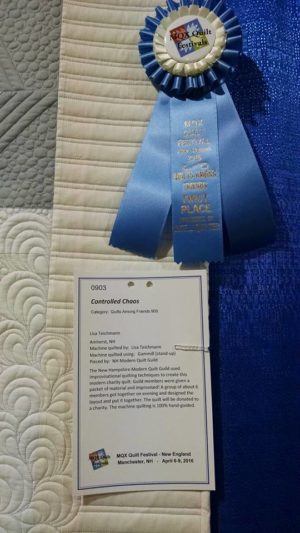 The second quilt I entered was pieced by the members of the New Hampshire Modern Quilt Guild and quilted by me for QuiltCon 2016 Charity Quilt Contest. I spent a good deal of time quilting this one and donated my time to the guild. Here is my blog post about quilting that quilt, Quilting a Modern Quilt.